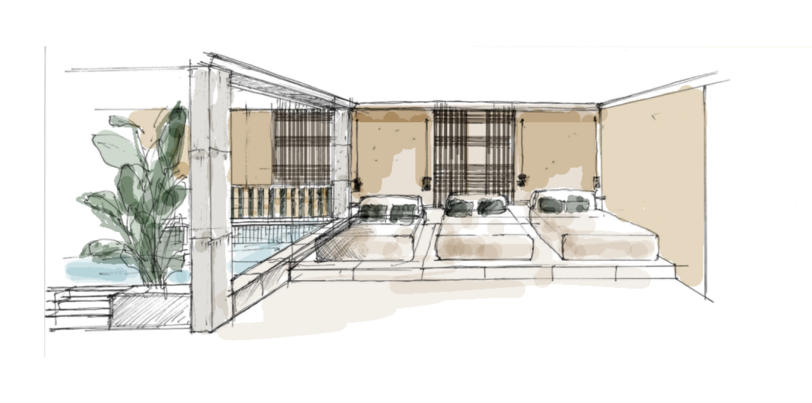 Ogni ambiente è curato nei minimi dettagli: giochi di luce, texture e piante creano un vero e proprio nido di pace e relax.
